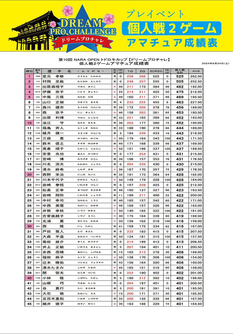 第10回NaraOpenトドロキカップ_成績表(ドリチャレ) Youtube 写真販売サービス「フォトレコ」 本大会予選:大会結果 プロ・アマ決勝トーナメント:大会結果 「フォトレコ」閲覧・購入には認証キーが必要となります。 【認証キー】6936-3457-4589-npqv 2024年8月24日(土)プレイベント「ドリームプロチャレ」 【ドリチャレ】個人戦2ゲームアマチュア成績(1~45)_ダウンロード 【ドリチャレ】個人戦2ゲームアマチュア成績(46~96)_ダウンロード 【ドリチャレ】ベーカー戦1ゲーム目成績_ダウンロード 【ドリチャレ】ベーカー戦2ゲーム目成績_ダウンロード