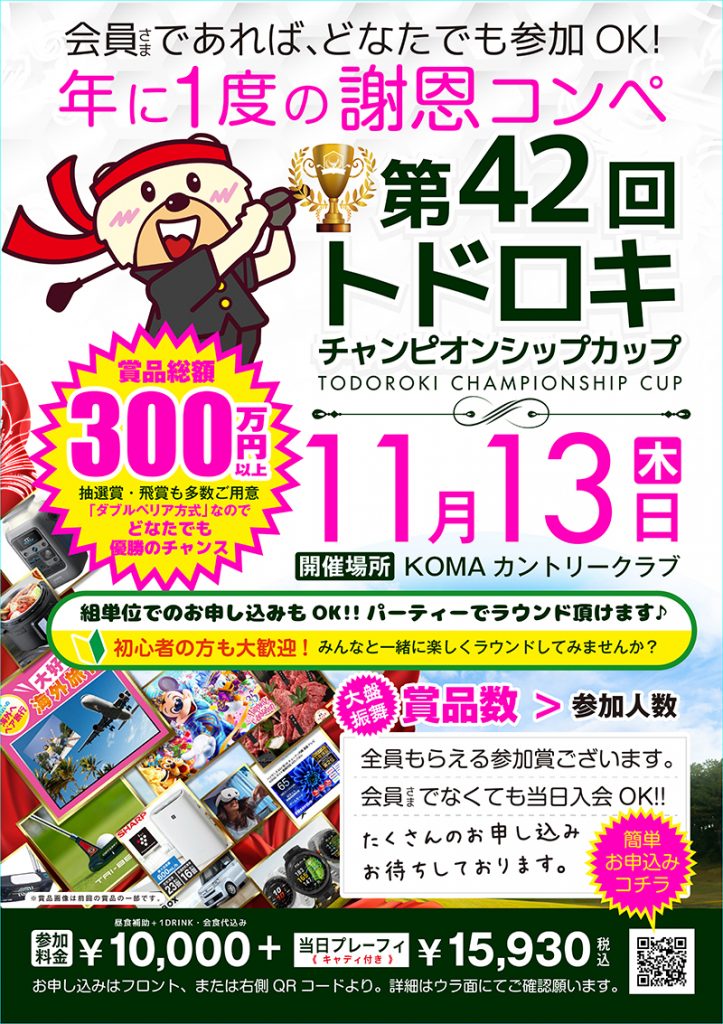 2025年11月13日(木)に、 「コマカントリークラブ」にて 年に一度の謝恩を込めたトドロキ主催コンペ 第42回「トドロキチャンピオンシップカップ」を開催します!!